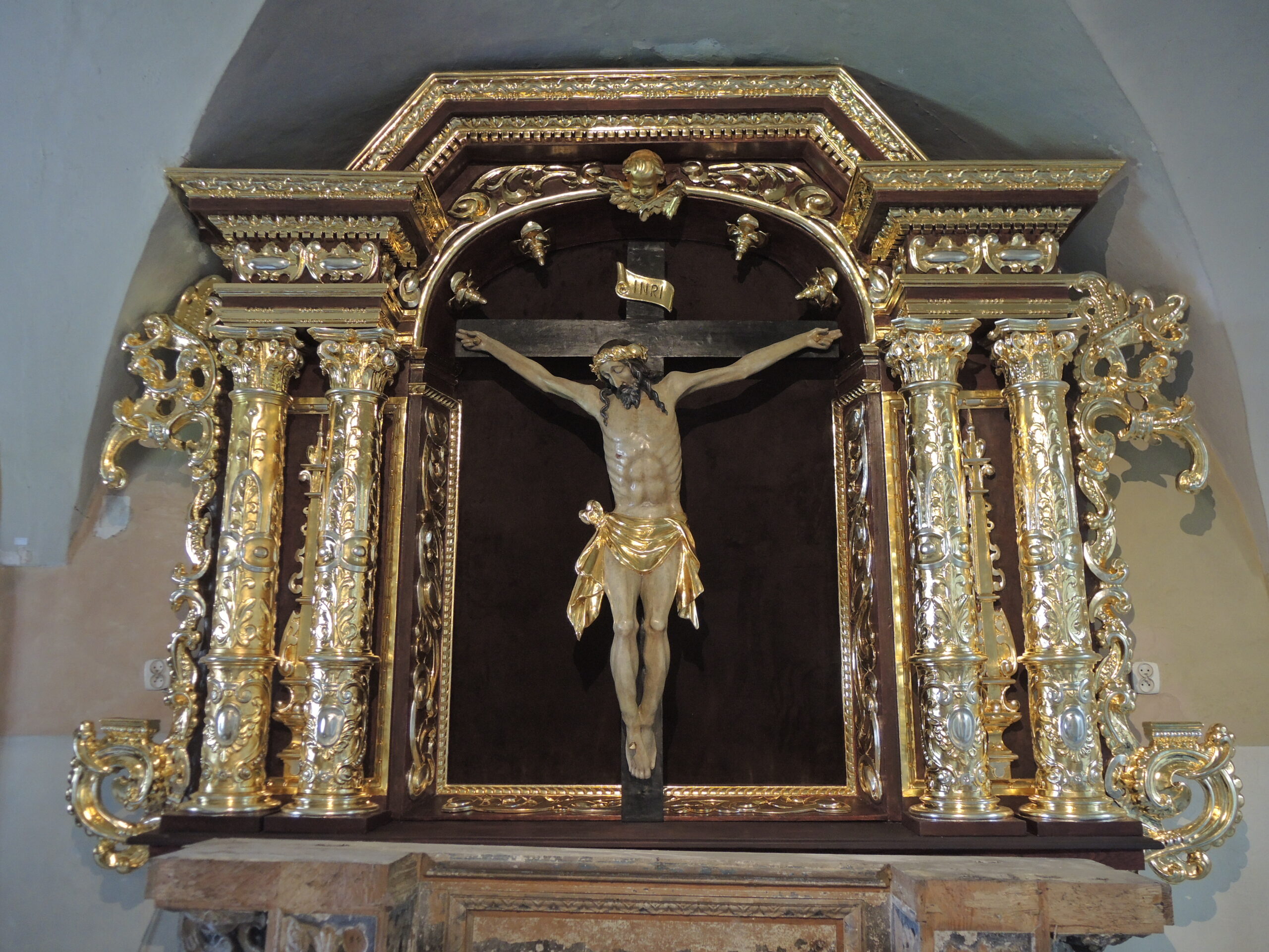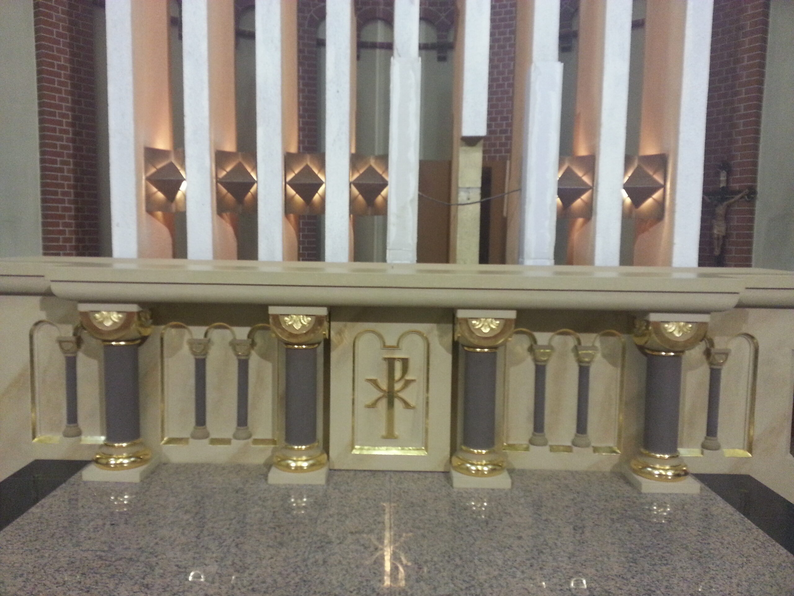 Projekt i wykonanie tabernakulum, z zastosowaniem metalowej, prostopadłościennej skrzyni okolonej drewnianą obudową. W jej zakres wchodzą półokrągłe drzwiczki z płaskorzeźbionym motywem Dobrego Pasterza oraz esownice. Całość odnosząca się do kształtu i stylistyki obrotowego, oryginalnego tabernakulum.