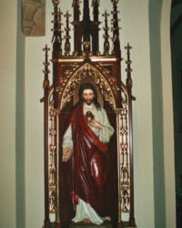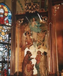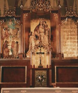 Rekonstrukcja neogotyckiej szafy ołtarzowej, wykonana na podstawie archiwalnych zdjęć oryginalnego ołtarza, dla kościoła pod wezwaniem Matki Bożej Królowej Różańca Świętego w Łaziskach Górnych.
